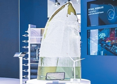 西門子能源展出全球首款可回收風(fēng)機(jī)葉片。葉片使用周期結(jié)束后,其部件材料可通過工業(yè)化方式,進(jìn)行樹脂和纖維材料的安全環(huán)保分離,回收的纖維材料仍保持良好性能。本報(bào)記者 廖睿靈攝