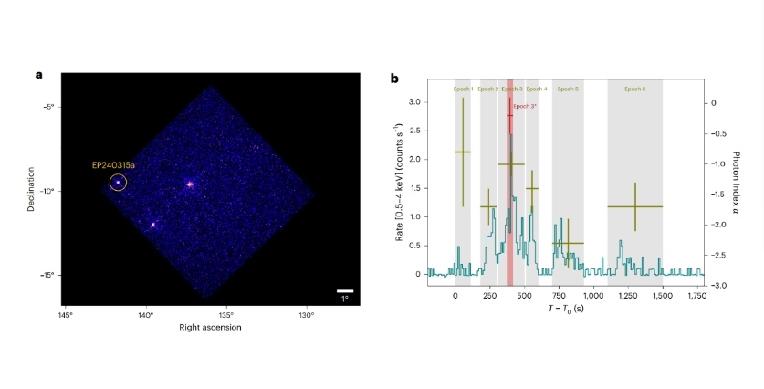 此后,世界各地多個天文望遠鏡陸續(xù)觀測到EP240315a。研究結果表明,EP240315a產生于遙遠的早期宇宙,當時宇宙年齡僅為現在的10%,EP240315a的信號花費了125億年才抵達地球。