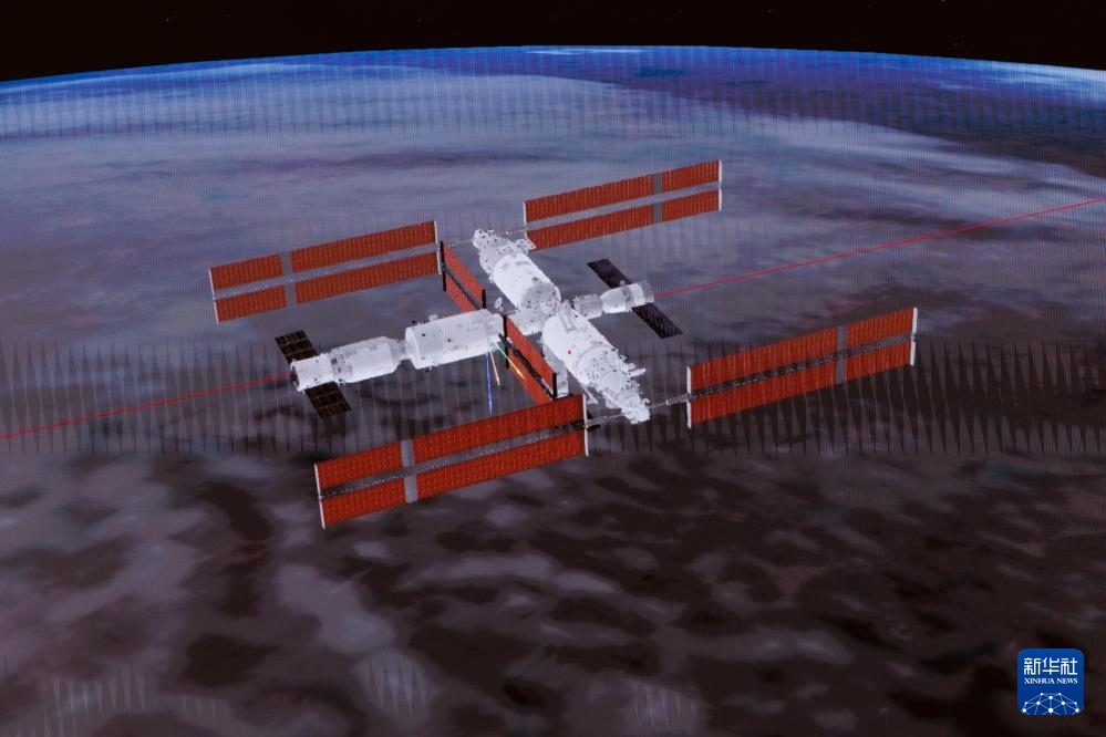 4月24日在北京航天飛行控制中心拍攝的神舟二十號載人飛船成功對接空間站天和核心艙的模擬畫面。新華社記者 金立旺 攝