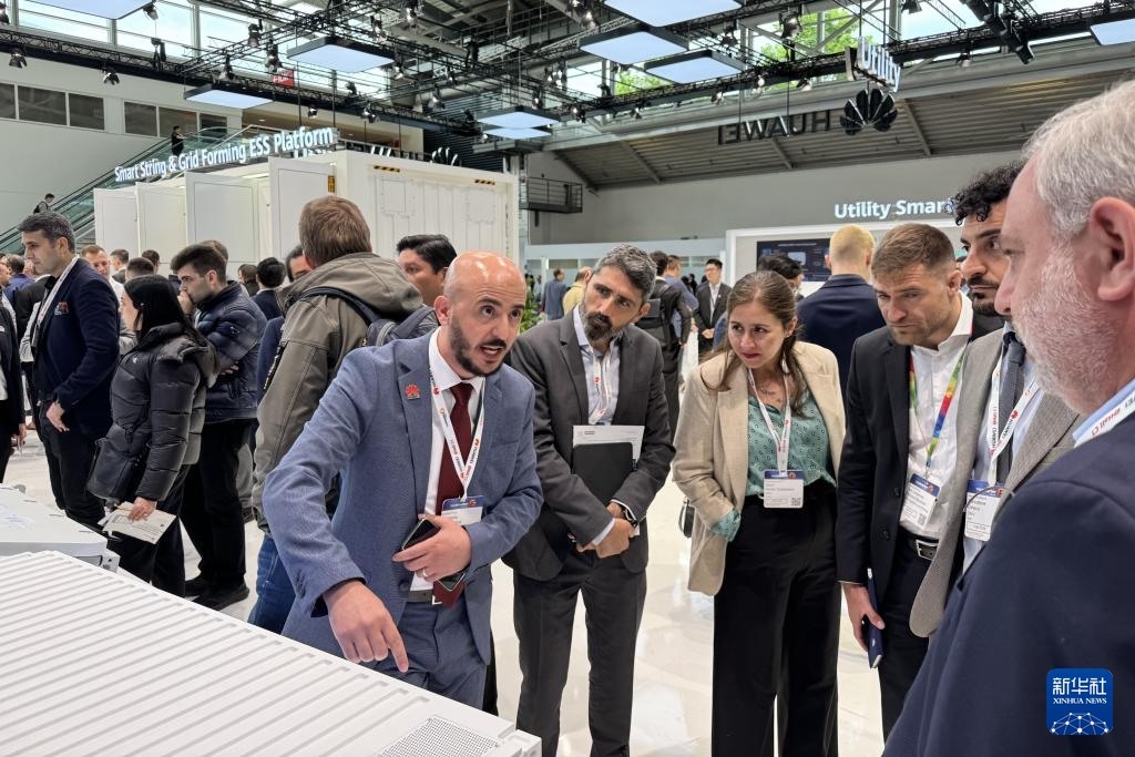 5月7日,參觀者在德國慕尼黑舉行的2025年歐洲國際太陽能展上參觀華為展區(qū)(手機(jī)照片)。新華社記者 黃燕 攝