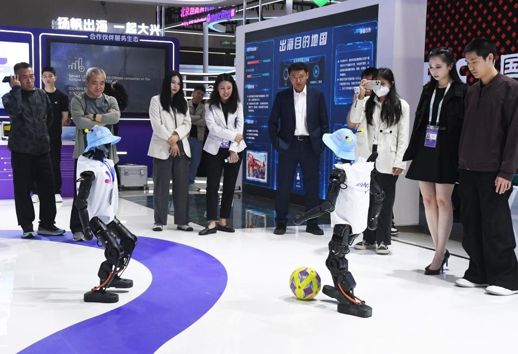5月8日,機器人在第二十七屆中國北京國際科技產(chǎn)業(yè)博覽會大興展臺展示踢足球。新華社記者 任超 攝