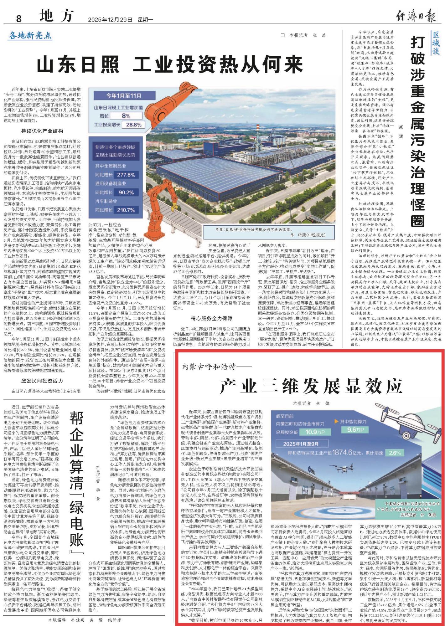 2025年12月29日,《經(jīng)濟日報》第8版刊發(fā)題為《內(nèi)蒙古呼和浩特——產(chǎn)業(yè)三維發(fā)展顯效應(yīng)》的文章,報道了內(nèi)蒙古自治區(qū)呼和浩特市堅持以現(xiàn)代化產(chǎn)業(yè)體系為引領(lǐng),通過鏈式整合、區(qū)域協(xié)同與創(chuàng)新驅(qū)動,推動產(chǎn)業(yè)向高端化、智能化、綠色化轉(zhuǎn)型,培育新質(zhì)生產(chǎn)力,形成“傳統(tǒng)產(chǎn)業(yè)升級+新興產(chǎn)業(yè)突破+未來產(chǎn)業(yè)培育”的三維發(fā)展模式。