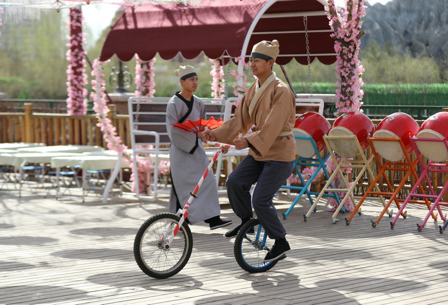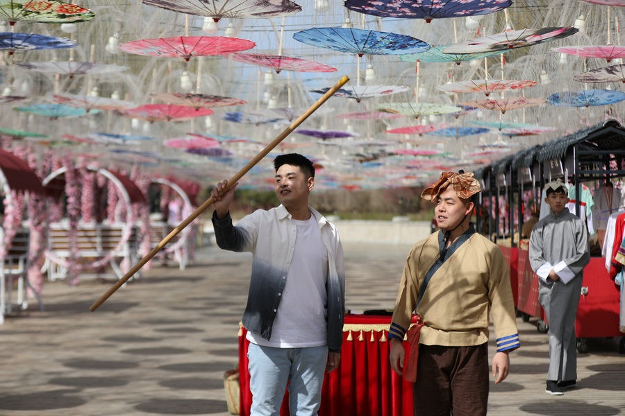 園區(qū)昔日的觀景臺(tái),今日變身“迎春路”,花團(tuán)錦簇的搖椅,五顏六色的油紙傘,身著古典裝扮的演員,精彩絕倫的雜技表演,吸引著游客艷羨的目光,引來(lái)陣陣歡呼。蹴鞠、投壺等民俗互動(dòng)游戲讓游客參與其中,各色美食,令人大快朵頤,“迎春路”上春光燦爛,儼然一片歡樂(lè)的海洋。