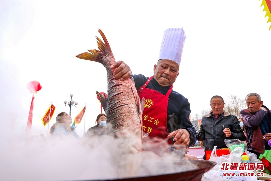 3月11日,托克托縣“黃河開河魚節(jié)”上,廚師正在烹飪開河魚。近日,隨著北方氣溫逐漸回升,黃河托克托縣段冰河加速開河。 樂(lè)炎攝影報(bào)道
