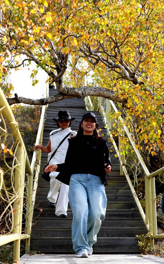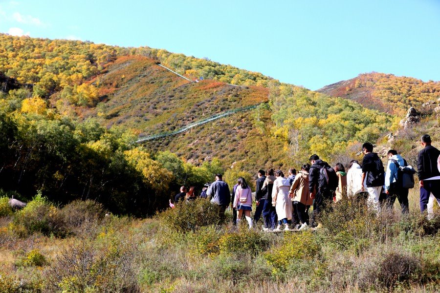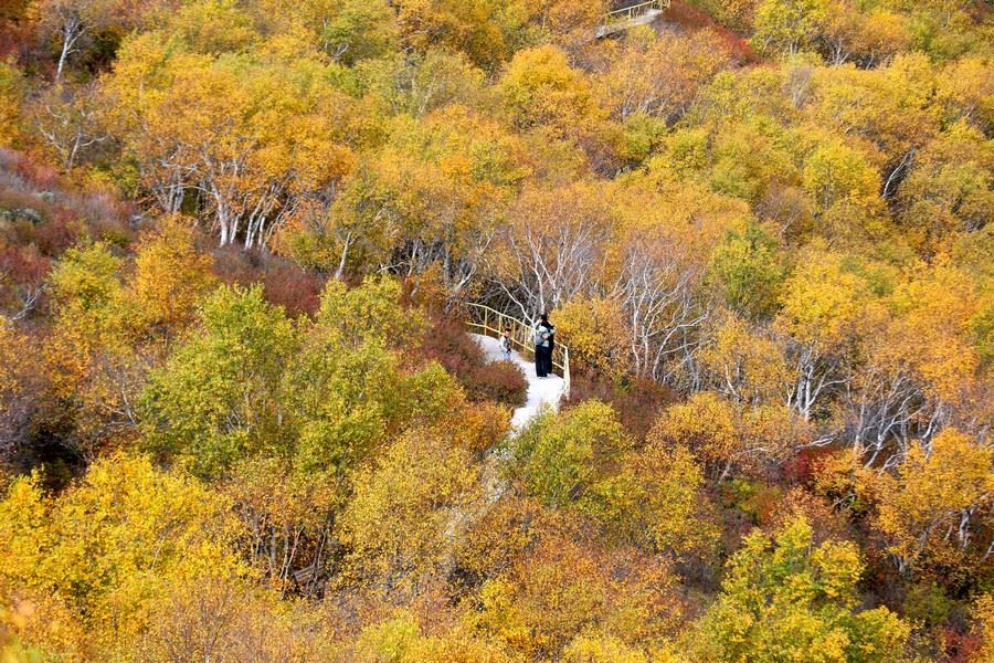 9月26日,游客在一片金黃的固陽馬鞍山游玩