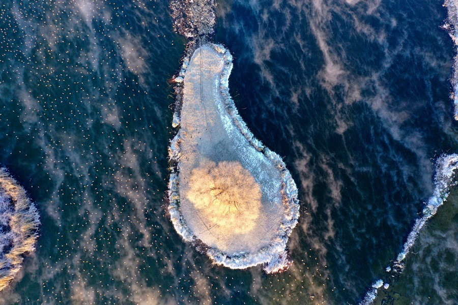 12月15日,上萬只赤麻鴨在塞外“千島湖”棲息游弋