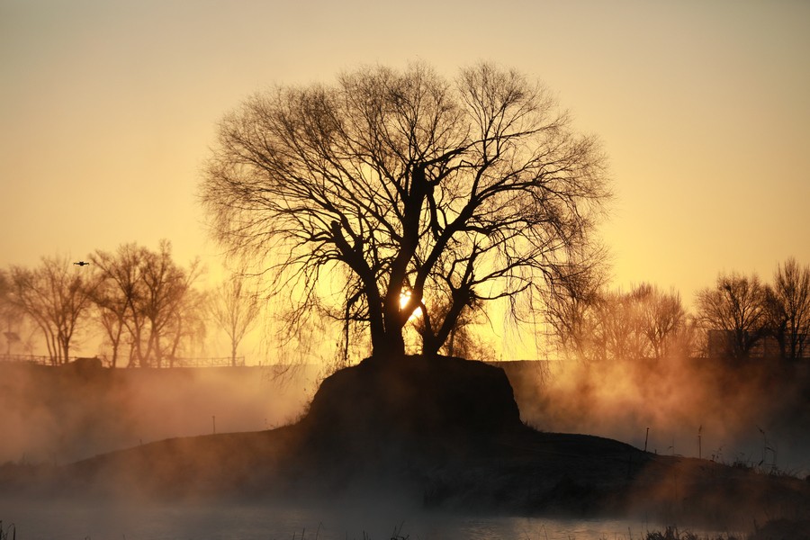 12月15日,日出時(shí)刻呼和浩特的塞外“千島湖”一片金色光芒