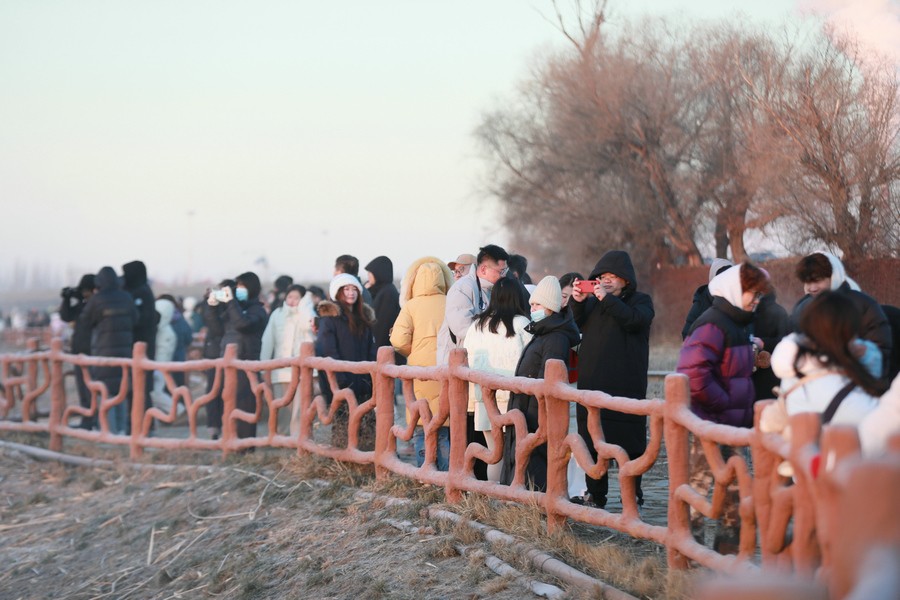 12月15日,游客在塞外“千島湖”畔等待日出