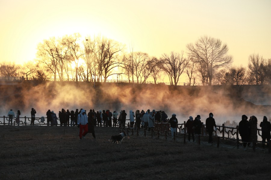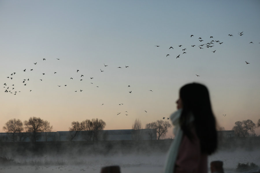 12月15日清晨,上千名游人在呼和浩特玉泉區(qū)班定營村南側(cè)的塞外“千島湖”畔賞景打卡。此處湖水為城市污水經(jīng)處理達(dá)標(biāo)后的再生水,隆冬時(shí)節(jié),再生水流入湖中,水汽蒸騰,岸邊草木霧凇皚皚,良好的生態(tài)吸引了數(shù)萬只赤麻鴨在此翔集棲息,構(gòu)成一幅生動(dòng)和諧的美麗畫面。每日清晨,都有上千名游客來此觀日出賞美景。