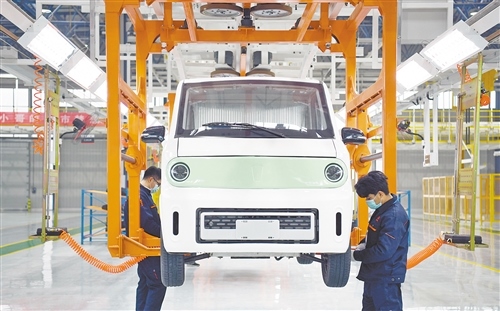 12月12日,工人在總裝車間組裝新能源快遞車。當(dāng)日,由山東豪馳智能汽車有限公司投資、中建電力建設(shè)有限公司承建的智能新能源商用車制造基地在山東濟南市萊蕪區(qū)投產(chǎn)。新華社記者 金良快攝