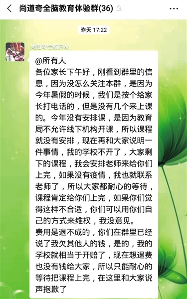 根據(jù)謝女士提供的轉(zhuǎn)賬證明和聊天截圖記者注意到,“尚道奇全腦教育體驗(yàn)群”1月15日發(fā)布的一則通知稱,今年暑假,機(jī)構(gòu)老師曾挨個(gè)給家長(zhǎng)打電話通知上課,但是沒有幾個(gè)來上課的,加上教育局不允許線下機(jī)構(gòu)開課,所以課程遲遲沒有安排。并稱學(xué)校賠錢了,沒有錢退給大家,只能耐心等待疫情結(jié)束后安排上課,如果家長(zhǎng)覺得不合適,可以用自己的方式維權(quán)。“她的說辭明顯前后矛盾,暑假期間說課件損毀,現(xiàn)在又說沒學(xué)生上課?!敝x女士氣憤地說,和她遭遇同樣情況的還有30多名家長(zhǎng),399元雖然不是大數(shù)目,但這樣欺騙大家實(shí)屬不該。