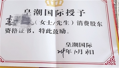 皇潮醫(yī)療美容為李女士頒發(fā)的消費(fèi)股東資格證書(shū)