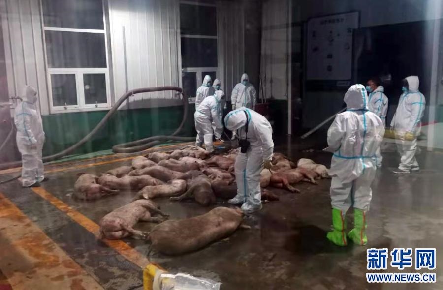 3月21日,工作人員在達拉特旗病死畜無害化處理中心對收集的死豬進行無害化處理。新華社發(fā)