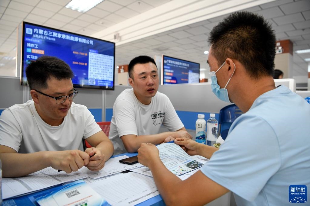 求職者(右一)在2021年寧夏銀川夏季人才招聘大會暨高校畢業(yè)就業(yè)雙選招聘會上與用人單位交流(7月24日攝)。新華社記者馮開華攝