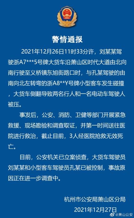 中新網(wǎng)12月27日電 杭州市公安局蕭山區(qū)分局27日通報,12月26日11時33分許,一大貨車與一小型客車在蕭山區(qū)一路口發(fā)生碰撞,大貨車側翻導致兩名行人和一名電動車駕駛人被壓。截至目前,3人經(jīng)醫(yī)院搶救無效死亡。
