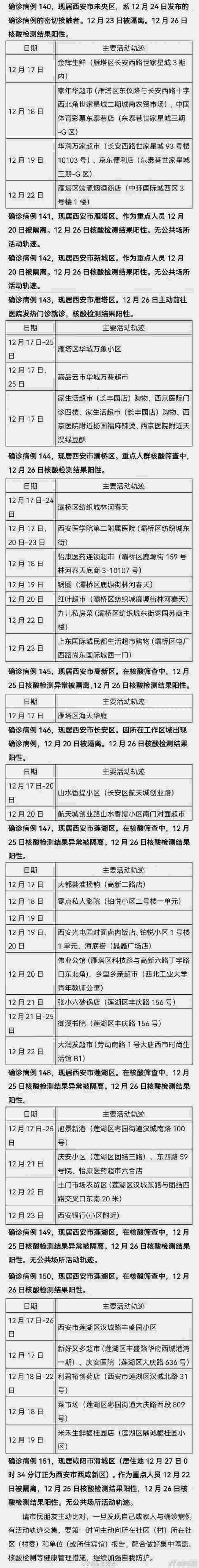根據(jù)疾控等部門流調(diào)情況,12月26日0-24時西安市新增的150例確診病例的公共場所活動軌跡公布如下: