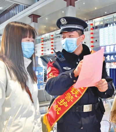 電子臨時身份證的推行增強了旅客出行的便捷性。圖為春運首日,大同鐵路公安處民警為旅客講解電子臨時身份證在手機軟件上的使用方法。