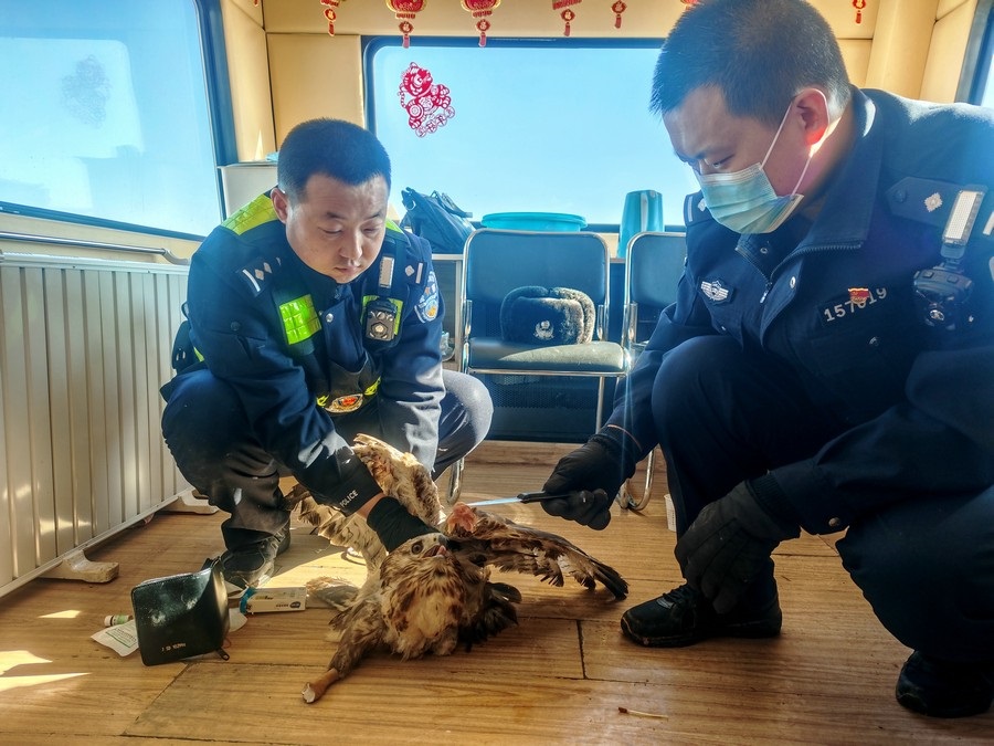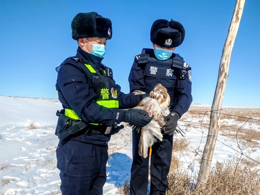 北疆新聞網(wǎng)、北疆新聞APP、北疆云消息(記者 劉嬙 通訊員 張路 張冬)2月10日,內(nèi)蒙古烏蘭察布市四子王旗腦木更邊境派出所民警在執(zhí)勤巡邏途中,發(fā)現(xiàn)一只“大鳥(niǎo)”被困在網(wǎng)圍欄上。民警靠近后仔細(xì)觀察發(fā)現(xiàn),這只“大鳥(niǎo)”在奮力撲打翅膀但無(wú)法飛行,右爪缺失,受傷嚴(yán)重。民警通過(guò)手機(jī)搜索網(wǎng)絡(luò)圖片比對(duì),初步判定為國(guó)家二級(jí)保護(hù)動(dòng)物鷹隼。