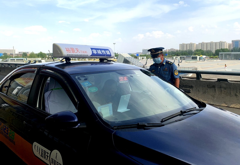 6月3日下午,呼和浩特白塔機(jī)場,呼和浩特市交通運(yùn)輸綜合執(zhí)法支隊(duì)白塔機(jī)場中隊(duì)正在對(duì)機(jī)場接送客的出租車進(jìn)行檢查。