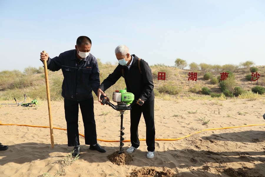 探訪團(tuán)成員體驗(yàn)“螺旋鉆植樹法”植樹 記者 張楊攝影