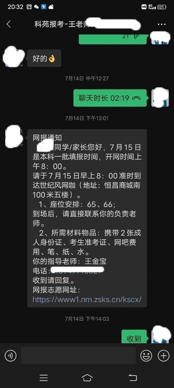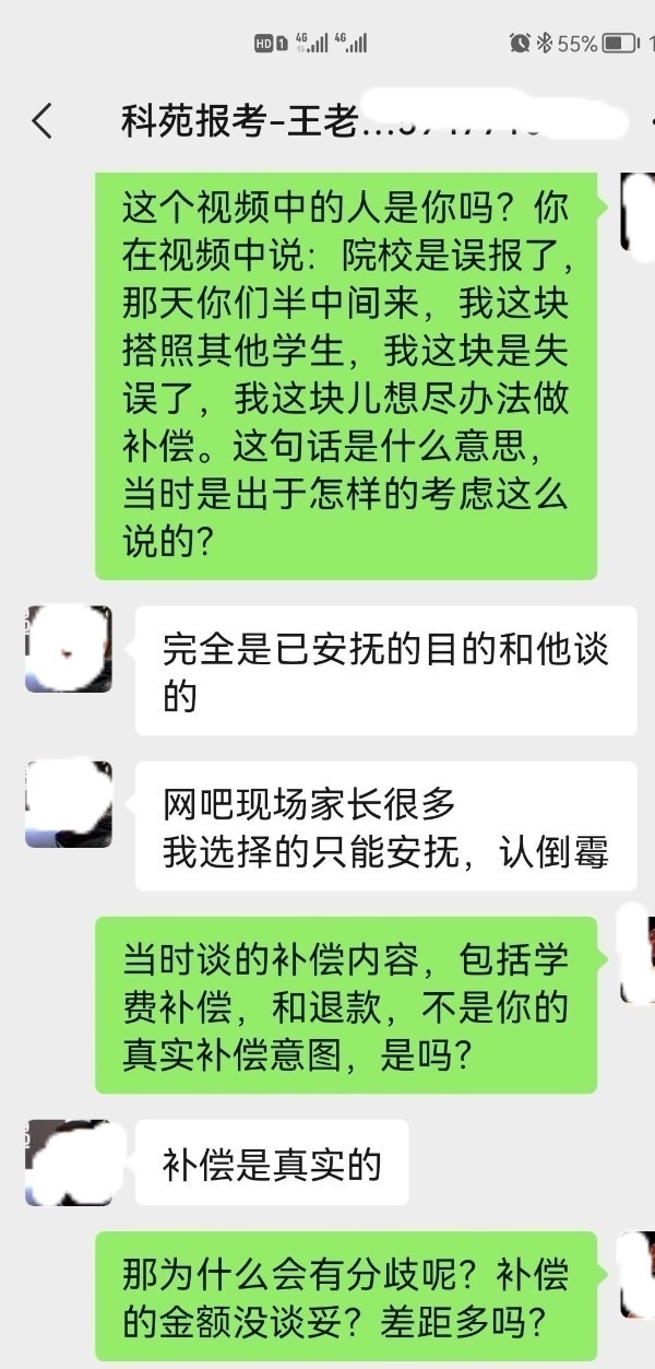 據(jù)樊女士介紹,負(fù)責(zé)給小安報(bào)志愿的是科苑報(bào)考的王金寶老師,也是內(nèi)蒙古科苑信息科技有限公司的股東之一。樊女士提供的視頻顯示,這名老師在網(wǎng)報(bào)志愿現(xiàn)場(chǎng)回復(fù)樊女士:“院校就是誤報(bào)了,因?yàn)槟翘炷銈兪前胫虚g來(lái),還有其他學(xué)生,搭照學(xué)生,我這塊兒就失誤了,我這塊兒想盡辦法做補(bǔ)償?!比欢?,樊女士反映,那天以后,這名老師開(kāi)始反口,不承認(rèn)誤報(bào),也不愿意按照當(dāng)天商定的補(bǔ)償方案執(zhí)行。