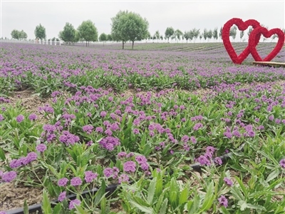 8月23日,記者來(lái)到馬鞭草花海,遠(yuǎn)遠(yuǎn)望去,遍野的紫色在視線中彌漫開(kāi)來(lái),叫人情不自禁奔向花海。微風(fēng)拂過(guò),花枝搖曳,心形造型、大風(fēng)車、馬頭琴等景觀小品點(diǎn)綴其間,給花海增添了一份浪漫情調(diào)。人們沿著