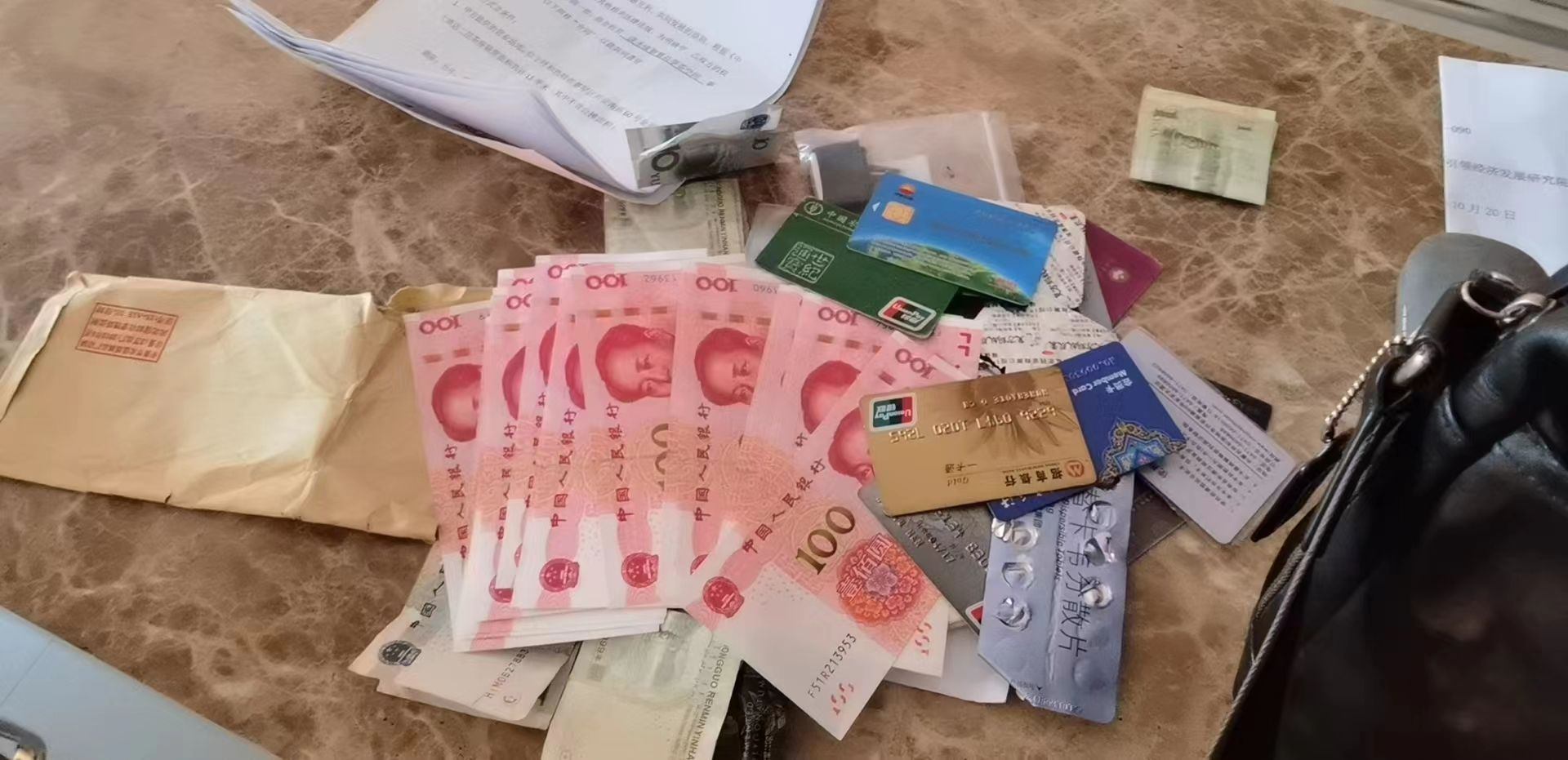 原來,當天15時許,呼和浩特市迎新路辦事處團結小區(qū)社區(qū)網(wǎng)格員聶霞和社區(qū)耿書記在團結小區(qū)東區(qū)物貿樓排查工作中,發(fā)現(xiàn)一垃圾箱旁邊有一個黑色的提包,打開一看,里面裝有近3000元現(xiàn)金和身份證、銀行卡以及多個貴重物品,想到失主一定很著急,聶霞馬上根據(jù)失主身份證上的信息聯(lián)系到失主所在的社區(qū)網(wǎng)格員劉淑萍,經過幾番周折,終于與失主取得聯(lián)系。經過電話溝通確認,半小時后,失主劉先生趕到團結小區(qū)社區(qū)居委會,認領了自己的物品。