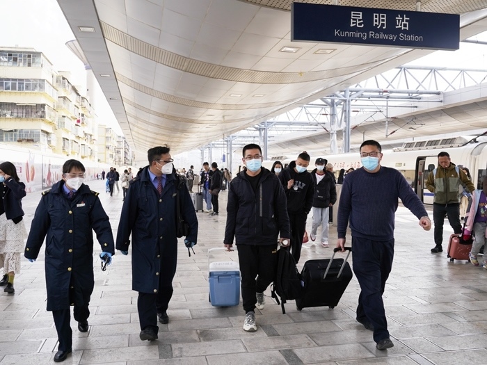 云縣站工作人員引導(dǎo)醫(yī)務(wù)人員進入站臺乘坐動車。中國鐵路昆明局集團有限公司供圖