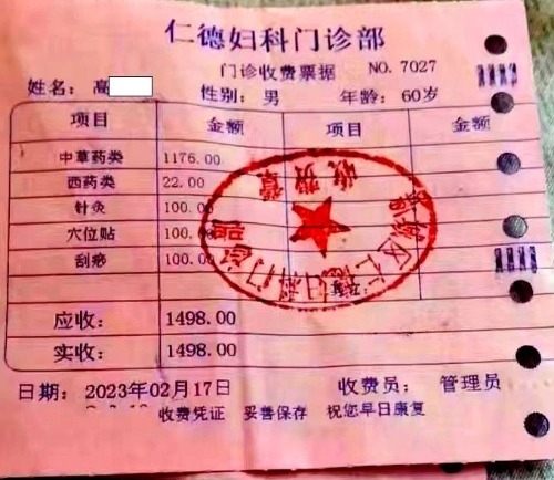 高先生被說(shuō)動(dòng)了,在王女士的陪同下來(lái)到了這名男子口中的“仁德醫(yī)院”。進(jìn)去以后,發(fā)現(xiàn)醫(yī)院的名字叫“仁德婦科門(mén)診”。醫(yī)生確實(shí)如男子所說(shuō)的那樣,告訴高先生不用做手術(shù),給開(kāi)了1498元的中藥和中醫(yī)治療項(xiàng)目(如圖)。