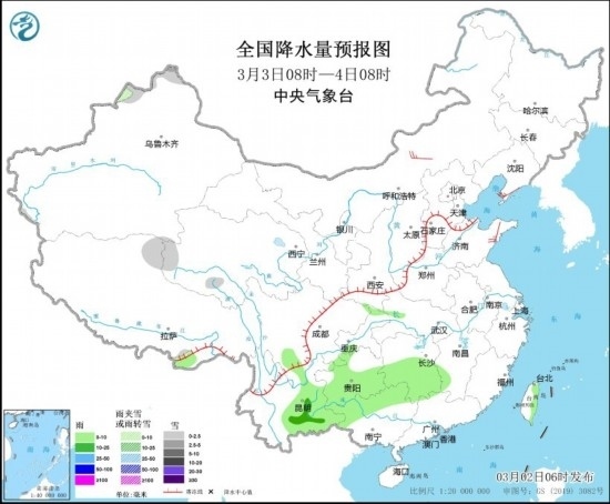 全國(guó)降水量預(yù)報(bào)圖(3月2日08時(shí)-3日08時(shí)) 圖片來(lái)源:中央氣象臺(tái)網(wǎng)站