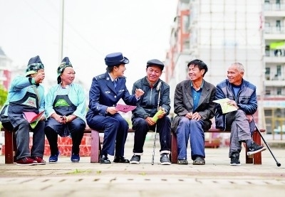 3月14日,在西平縣老王坡高標(biāo)準(zhǔn)服務(wù)中心的二樓平臺(tái),臺(tái)曉林(右)、王英凡和王仲琦(左)下班后在看夕陽。