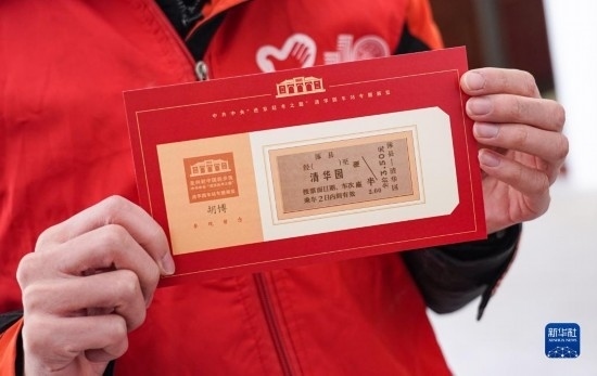 3月25日,在清華園車站舊址的專題展覽廳內(nèi),一名志愿者展示印有“老車票”的紀(jì)念卡片。
