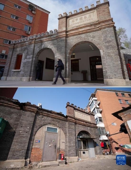 這是一張拼版照片:上圖是修繕后對(duì)外開(kāi)放的清華園車站舊址(2023年3月25日攝);下圖是修繕前的清華園車站舊址(2021年4月7日攝)。