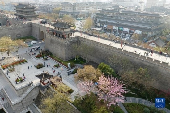 這是西安明城墻長(zhǎng)樂(lè)門(mén)景色(3月25日攝,無(wú)人機(jī)照片)。
