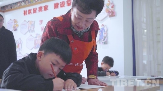 “這一筆要拉長,再拉長,對不對!”操著一口四川話的張惠英老人一邊把著孩子的手寫字,一邊微笑耐心地講解。在吉福社區(qū)的一間教室里,十來個孩子正在認真地練寫漢字筆畫,而教他們書寫的張惠英并不是真正的教師,而是孩子們的“共享奶奶”。