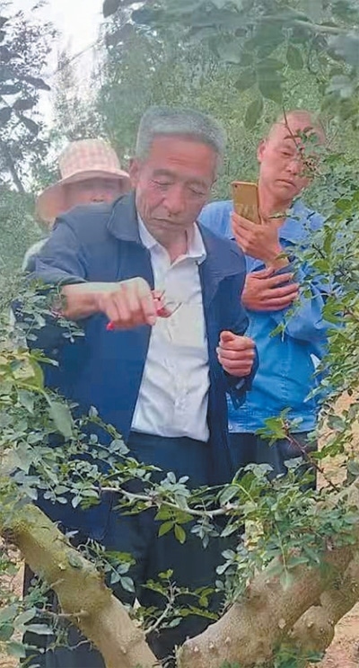 甘肅省秦安縣農(nóng)業(yè)技術(shù)推廣研究員靳志強(中)向農(nóng)民傳授剪枝技術(shù)。潘虎林攝