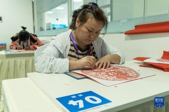 4月12日,在四川省綿陽市公共實(shí)訓(xùn)基地,參加剪紙項(xiàng)目的選手正在比賽中。