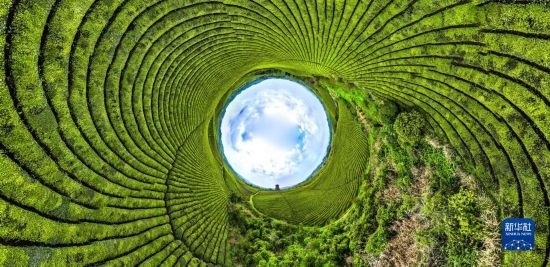 4月4日拍攝的遵義市湄潭縣永興鎮(zhèn)“萬畝茶?!保o人機全景拼接照片)。