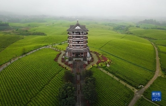 2021年4月12日拍攝的貴州省湄潭縣的“萬畝茶?!憋L光(無人機照片)。