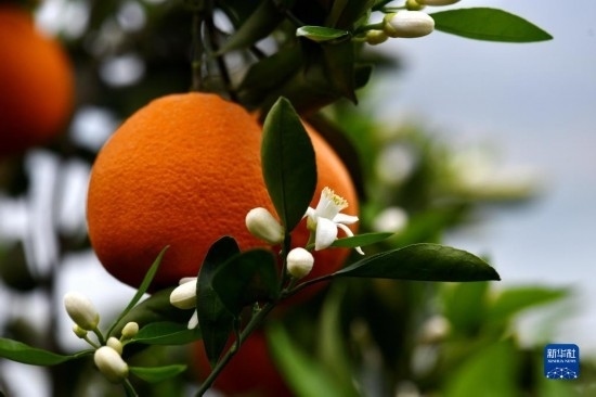 4月15日在秭歸縣歸州鎮(zhèn)香溪村拍攝的花果同樹的晚熟臍橙。