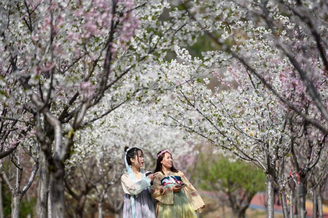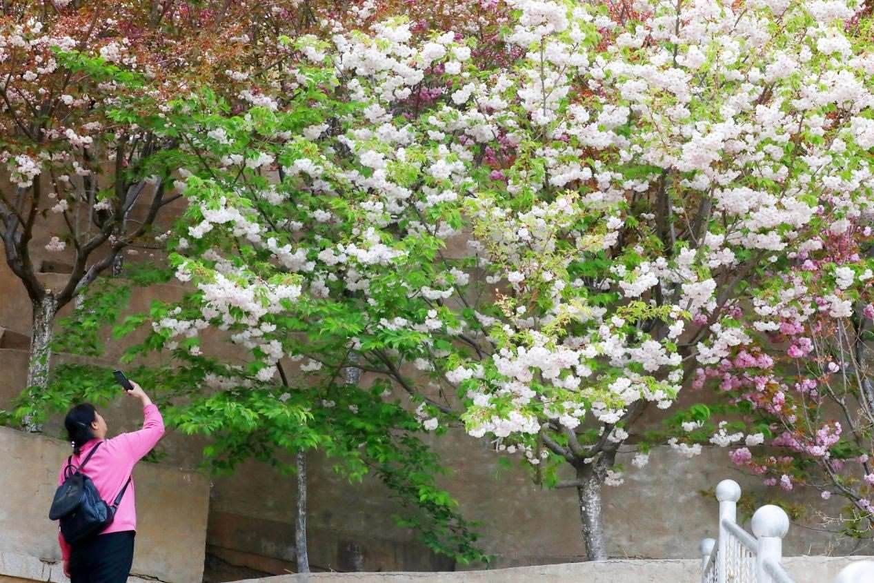 櫻花園里,各類櫻花搖曳生姿,爭(zhēng)相怒放,景色宜人,構(gòu)成一幅幅明麗的春日畫圖。前來觀賞的游客紛紛在櫻花樹下拍照打卡。