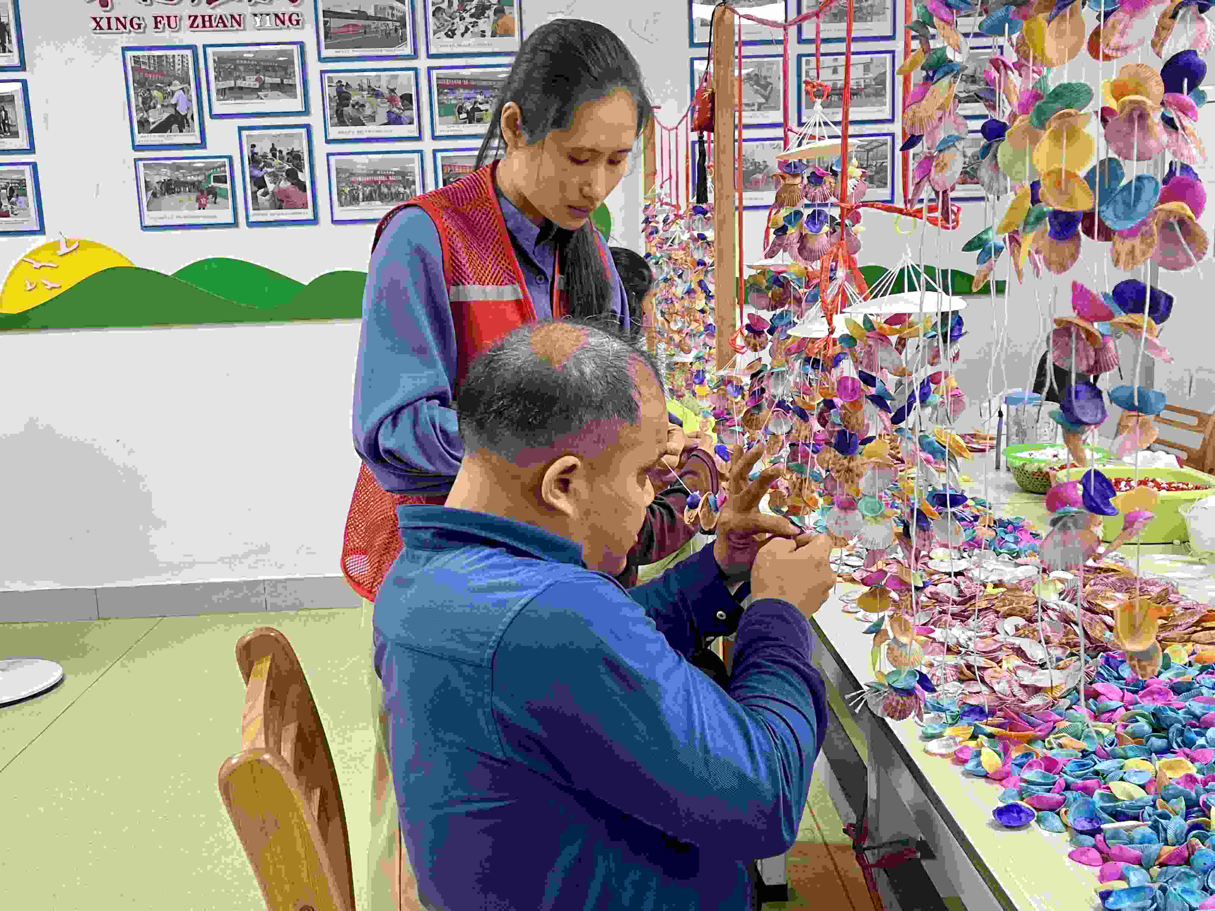 4月13日,工作人員教張清氧串貝殼。人民網(wǎng) 周靜圓攝