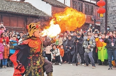 陜西省漢中市城固縣在上元觀古鎮(zhèn)開展民俗傳統(tǒng)節(jié)目展演,吸引眾多游客觀賞。劉曉東攝(人民視覺)