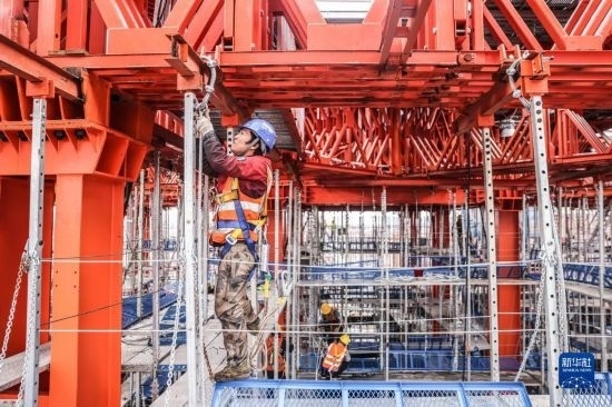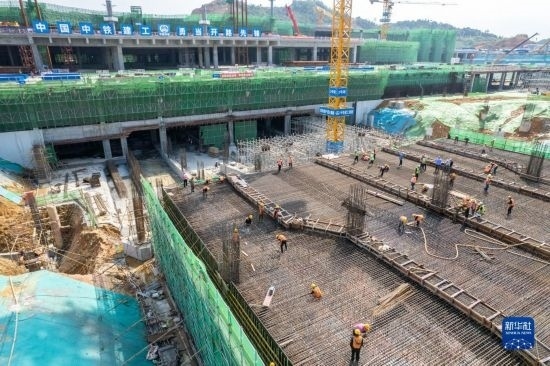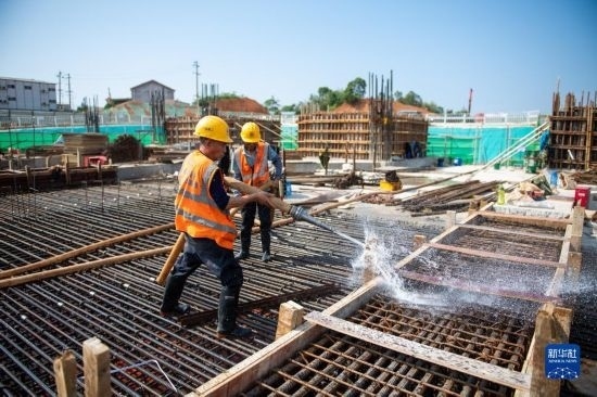 5月3日,在長(zhǎng)沙西站建設(shè)工地,工人做混凝土澆筑前準(zhǔn)備。