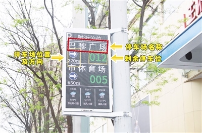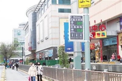 5月7日上午,在中山西路,記者看到懸掛的智能停車指引屏上顯示附近停車場(chǎng)的位置,以及停車場(chǎng)的停車位余量。維多利購(gòu)物中心附近的一個(gè)智能停車指引屏上顯示民族大世界有7個(gè)空余停車位、民族商場(chǎng)有18個(gè)空余停車位,而這些數(shù)據(jù)也在實(shí)時(shí)更新,市民根據(jù)智能停車指引屏的信息便能輕松找到停車位,不用再為停車難而發(fā)愁。