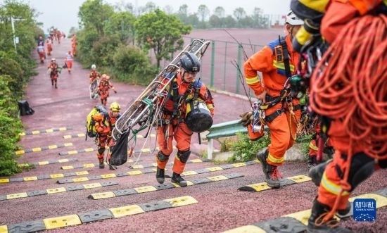 消防救援人員背負(fù)裝備前往演練場地(5月11日攝)。