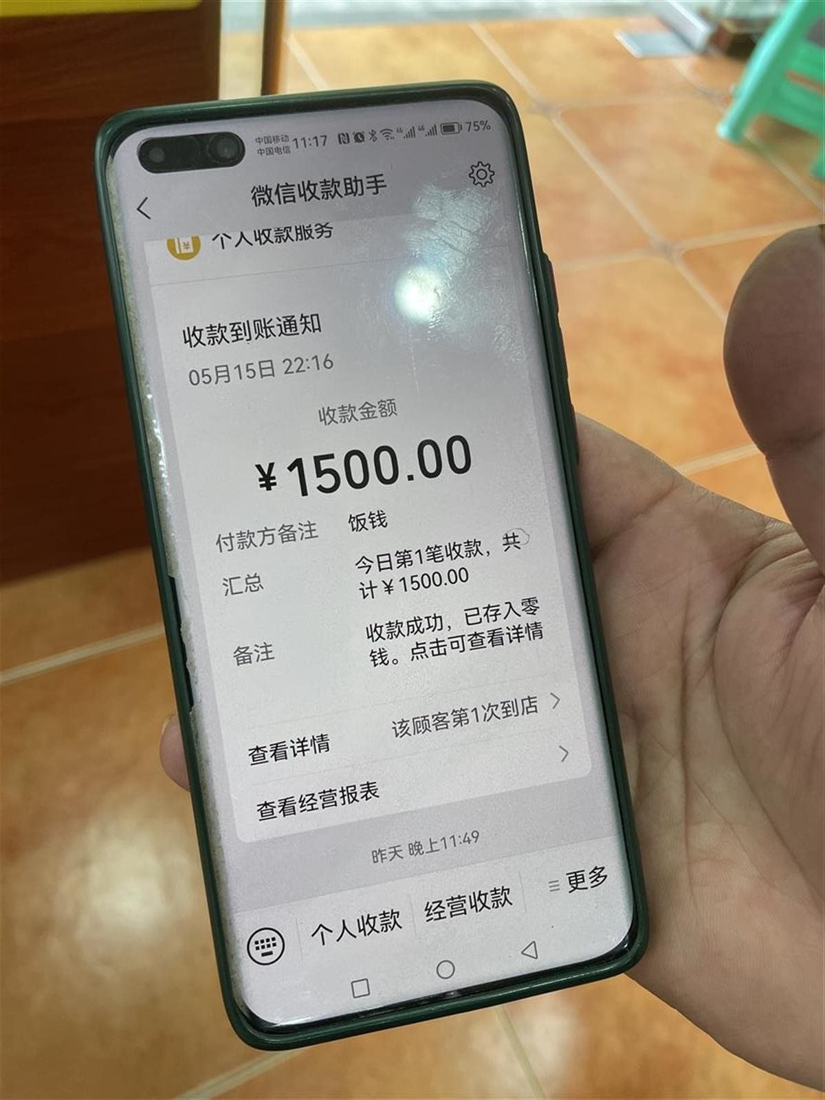肖先生出示的收款記錄顯示,5月15日22點(diǎn)16分,收到飯錢1500元。