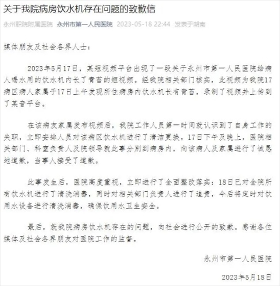 ·永州第一人民醫(yī)院致歉病房飲水機(jī)長青苔:追責(zé)相關(guān)部門負(fù)責(zé)人。