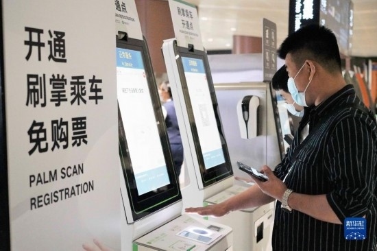 5月21日,乘客在北京大興機(jī)場(chǎng)線大興機(jī)場(chǎng)站的自助售票機(jī)前采集掌紋,開(kāi)通刷掌乘車(chē)服務(wù)。