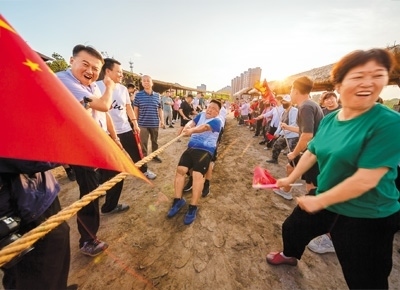 村民們進(jìn)行拔河比賽。
